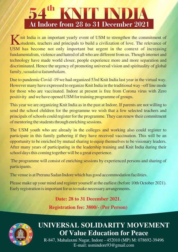The birth of Universal Solidarity Movement of Value Education for Peace (USM) was the result of a proactive response to the huge challenges faced by India due to communal politics, religious fundamentalism, ethnic conflicts, discrimination and rampant corruption, which were destroying the country. Fr. Varghese Alengaden, who had long years of experience of working with the youth, visualized a country which could be rebuilt by the youth. He had trust and faith in the youth and applied the ‘possibility thinking’ of ‘why don’t we train the youth to take charge of the nation with an inclusive, broad and lasting vision?’ With the dream of building a civilization of love with people of all castes, creed and culture, he made a life-long commitment to launch a holistic spiritual movement for transforming the country with the Gandhian principle of self transformation – ‘You Be the Change’. He abandoned the security of the church campus and moved into a small apartment in Indore city in the central Indian state of Madhya Pradesh on 16th July 1993, fully trusting in the providence of God.